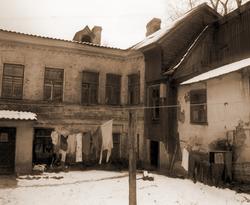 Приятный с парадной фасадной стороны дом №5 по улице Олега Кошевого со двора оборачивается жуткой развалюхой с выбитыми дверьми и забитыми фанерой окнами. С некоторым удивлением обнаруживаешь, что здесь живут люди. Не бомжи. Люди.