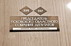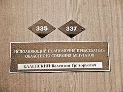 Во второй половине четверга (уже после решения суда!) на дверях приемной председателя Собрания табличка «Председатель областного Собрания Шматов Юрий Анисимович» оказалась заменена на табличку «Исполняющий полномочия председателя областного Собрания Каленский Валентин Григорьевич».