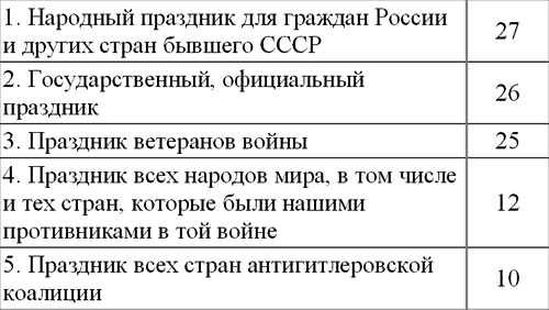 Молодежь в большей степени, чем представители остальных возрастных групп в контексте отмечания праздника думает о салютах, шествиях - то есть не столько об исторической значимости события как такового, сколько о самом факте праздника и его атрибутике. В тоже время молодежь не в меньшей мере, чем представители остальных возрастных групп высказывается и за проявление заботы о ветеранах.