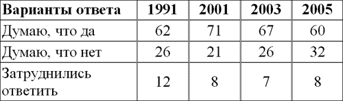 15-18 апреля 2005 года Аналитический Центр Юрия Левады (Левада-Центр) провел репрезентативный опрос 1600 россиян в 128 населенных пунктах 46 регионов России. Распределения ответов приводятся в процентах. Статистическая погрешность подобных опросов в пределах 3%.