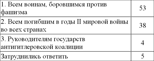 Чаще всего высказывались за установление памятника всем боровшимся против фашизма лица старше 55 лет. Опрошенные более молодых возрастных групп больше склонялись к мнению, что лучше было бы воздвигнуть памятник всем погибшим в годы второй мировой войны.