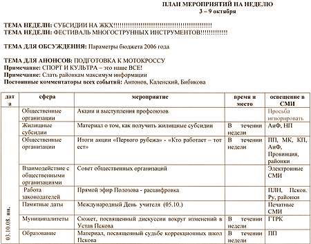 Первая строка в «плане мероприятий» на 3-9 октября гласила: «Сфера: «Общественные организации». Мероприятие: «Акции и выступления профсоюзов». «Время и место» - никаких сведений. «Освещение в СМИ: Просьба игнорировать». В оригинале файла эти два слова выделены красным цветом.