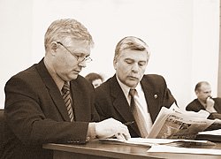 | Председатель политсовета псковской «Единой России» Алексей Сигуткин и председатель исполкома Дмитрий Хритоненков хотели бы читать в прессе новости из жизни только одной политической партии. Фото: Александр Тимофеев. |