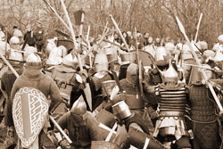 Для начала состоялась небольшая «битва» между немногочисленными всадниками. Правда, «немцы» и «русские» долго не могли съехаться на расстояние, достаточное для того, чтобы дотянуться мечом до противника. Затем, в бой пошла пехота. Закованные в броню рыцари, выстроившиеся хрестоматийной «свиньей», налетели на сомкнувших щиты воинов Невского и начали колошматить по ним секирами и мечами.