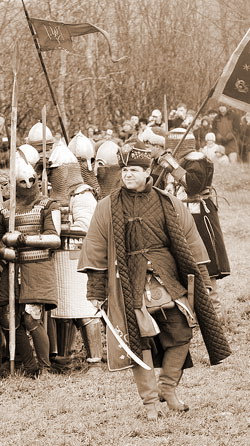Шоу началось с опозданием. «Русское» и «немецкое» войска выстроились на поле брани и не меньше получаса чего-то ждали. Примечательно, что крестоносцы смотрелись не в пример более выгодно из-за единообразия доспехов. Чувствовался немецкий «ордунг». «Наши» отличались разношерстностью доспехов и щитов. Впрочем, возможно, в этом была историческая правда.