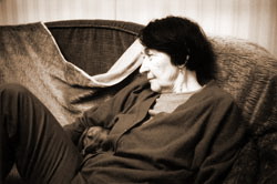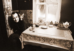 В кухне сидит, скрючившись, человек с котом на плече. Вся эта кухня с занавеской, клеенкой, предметами на столе возвращает фотографу прошлое в его буквальном виде. Персонаж к тому же глумливо улыбается, догадываясь, что из этого закупоренного времени не выскочишь. И окно затуманено, за ним, небось, тот же чайник, вмерзший в лед...