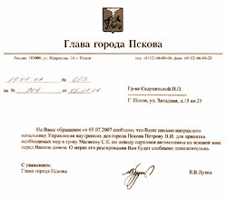 Однако в «Псковскую губернию» Надежда Петровна Седухинская пришла не затем, чтобы рассказать об успехе своей борьбы. Дело в том, что с нарушителями она боролась, привлекая на свою сторону не только правоохранительные органы. Надежда Петровна писала и главе города Пскова Яну Лузину, в деталях рассказав ему, в какие инстанции и к кому она уже обращалась. А когда получила от главы ответ, была сильно им впечатлена. И даже несколько обескуражена.