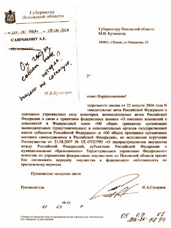 На прикрепленной к «входящей» бумаге (от руководителя Псковского территориального управления Росимущества Игоря Смирнова с предложением согласовать перечень имущества, передаваемого в федеральную собственность) записке, адресованной «профильному» вице-губернатору Алексею Сапрыкину, глава Псковской области твердым почерком начертал резолюцию следующего содержания: «Он че, сука, совсем нюх потерял? Ничего не согласую».