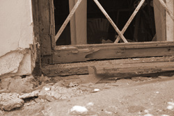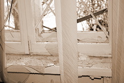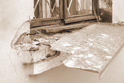 Осмотр здания с внешней стороны заставил задуматься о природе разрушений. Попытка проникновения в помещение через обрешеченные окна не имела смысла, тем не менее, внешняя рама была сломана и изрыта «оспинами», широкий жестяной карниз отлетел от стены, в которой зияло небольшое отверстие. Штукатурка внешней отделки здания в месте наибольших разрушений была сорвана, кирпичи потрескались.