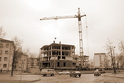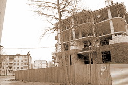 Мы писали, а строительство «7-8-9 этажного каркасно-монолитного 3-секционного жилого дома» в зоне регулирования застройки 1-й категории, прилегающей непосредственно к границе объединенной охранной зоны исторического центра Пскова, продолжалось полным ходом. На середину апреля 2008 года высота здания уже «переплюнула» ближайшие к ней 4-этажные «хрущобы». То есть «архитектурный позор», портящий вид одной из главных городских транспортных развязок, о котором так «болели» авторы «десантного» проекта, уже практически «прикрыт» новым строительством. Как «фиговым листом» гигантского размера.
