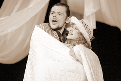 Антураж, знаете ли, заставляет подозревать банальный адюльтер. Курортный роман, то да сё, актёр этот наверняка женат, подлец. Хотя сценический антураж с этими подозрениями сильно диссонирует: уж больно он свадебный (художник спектакля – Валерий Мелещенков). Постель во всю сцену, цельность покровов которой Вера никак не решается нарушить. Над постелью довлеет огромный венок невесты с призрачно-прозрачной фатой…
