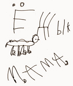 Пыталась я и научить ребенка писать «мама-папа-Саша-Лев», из чего младенец сделал весьма специфические выводы. Письмо и рисование, похоже, спутались в его воображении. Теперь он рисует маму как букву «А» с разбегающимися в разные стороны глазами, а папу изображает, как наделенную условно человеческими чертами букву «П».