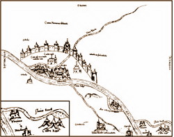 | Карта 1581 г. из Ватиканского архива. На врезке: окрестности Воронича и лагерь Стефана Батория. |
