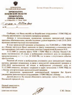 «В ходе проведенной проверки установлено, что 25.09.2009 в 1 ГОМ УВД по г. Пскову поступило Ваше заявление по факту совершения в отношении него противоправных действий о получении телесных повреждений Будкиным Н. П. [так в тексте – ред.]. 31.12.2009 по данному факту УУМ 1 ГОМ УВД по г. Пскову Мишин С. В. вынес постановление об отказе в возбуждении уголовного дела… в связи с отсутствием события преступления. Решение об отказе в возбуждении уголовного дела прокуратурой города изучено, признано незаконным, в связи с неполнотой проведенной проверки и 25.01.2010 постановление об отказе в возбуждении уголовного дела от 31.12.2009 отменено, материал направлен в адрес начальника 1 ГОМ УВД по г. Пскову для организации дополнительной проверки. О результатах проведенной дополнительной проверки Вы будете уведомлены дополнительно сотрудниками 1 ГОМ УВД по г. Пскову», - оптимистично резюмировал прокурор.