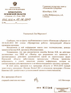 Наконец, 25 января 2010 года г-н Батов получил от первого заместителя прокурора Пскова Сергея Ляхова ответ «по существу». Однако содержание данного документа не поддавалось расшифровке.