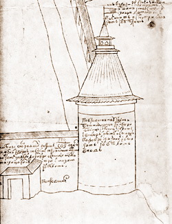 | Рукописный план Пскова 1694 г. Ивана Молчанова. Изображение Покровской башни. Выкопировка архитектора А. И. Хамцова (1955 г.). |