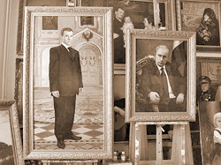 | Дмитрий Медведев (слева) и Владимир Путин (справа) смотрят на окружающий мир из позолоченых рам дорогих картин современных придворных художников. |
