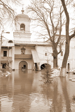 Вода прибывала, уже были затоплены подвалы и первые этажи Братского корпуса, колокольни, Стефановской церкви. Братия металась, по пояс в воде перенося имущество. А в соборе вода стала просачиваться из открытых археологических шурфов, подтекала под стены из цементных продухов, окружающих собор снаружи (и сделанных именно для отвода вод от собора в 1915 году, после очередного наводнения) [ 2 ].