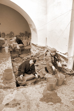 Весь штат музейного отдела уже боролся с водой, проходившей в шурфы: вычерпывали, носили ведрами в наружные стоки. Работа была безостановочной и круглосуточной. Любая помощь стала жизненно важной для спасения стен с фресковой живописью XII века от влаги, поднимавшейся снизу.
