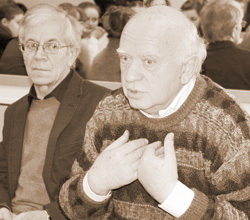 | Rомпозитор Сергей Баневич (справа), заслуженный артист России, скрипач, профессор Владимир Стопичев (слева). Фото: Псковская областная филармония |
