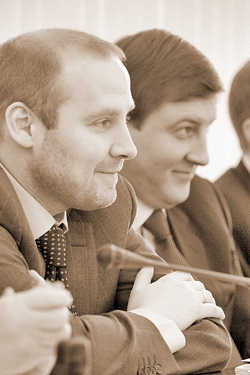 | Максим Жаворонков (слева) и Андрей Турчак (справа) возлагают особые надежды на председателя областной избирательной комиссии Николая Цветкова. Фото: Александр Сидоренко |