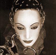 Покроем все лицо светлым тоном, запудрим светящейся пудрой (пудра с перламутром, преломляющая свет таким образом, что кожа как будто светится изнутри). На щеки по диагонали нанесем румяна с перламутром и более интенсивным цветом – вокруг глаз до бровей, растушевывая цвет к кончику брови также по диагонали. И самый ответственный художественный момент – макияж глаз. И тут на сцену выходит наконец черный цвет, долго ждавший этой роли. Жгуче-черным цветом покроем внутренний контур по верхнему и нижнему веку, четко прорисовывая уголки – это сузит глаза и придаст им оттенок черного бархата. Этим же цветом усилим эффект раскосых глаз – проведем внешний контур вверху и внизу, опуская и заостряя внутренние уголки, поднимая и заостряя внешние. Около внутреннего уголка сделаем светлый штрих белым перламутром и получим эффект эпикантуса. Этим же цветом подчеркнем линию верхнего века, что придаст взгляду загадочность и глубину. Ресницы подкрасим черной тушью, а кончики покроем синей. Черным цветом придадим бровям четкую линию, повторяющую раскосый разрез глаз. Для макияжа губ возьмем ярко-красный цвет, совпадающий по тону с прилегающим к лицу шарфиком и украшениями на голове. Это будет создавать гармонию цвета. Контурным карандашом увеличим губы по всему периметру и покроем ярко-красной помадой с увлажняющим блеском, что будет также гармонировать с блеском шарфика и украшений.