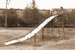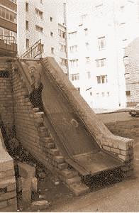 Даже если вы несколько раз в день будете проходить мимо этого сооружения во дворе между домами № 31 и 31-а на улице Красноармейской в Пскове, все равно сразу не догадаетесь о его предназначении. Выложенная из кирпича коробка, примерно четырехметровой высоты, с отвесными стенами и двумя металлическими желобами, спускающимися сверху до самого низа, может быть чем угодно. Внутри нее что-то гудит. Вокруг – асфальт. И только увидев стоящего на самом верху этой громадины ребенка и оправившись от испуга за него, вы зададите себе вопрос – как и почему он туда попал, затем с ужасом поймете, что сейчас он начнет спускаться по металлическому желобу, потому что каменный монстр – детская горка. При этом для вас останется загадкой, как он туда забрался? Никакой лестницы, ведущей на четырехметровую высоту, нет. Единственно возможный путь – по кирпичам, торчащим рядом с желобом. Потеряв при этом равновесие, удержаться не за что. Но если даже подъем закончится благополучно, степень опасности для здоровья ребенка не становится меньше. Ибо его спуск по железному желобу завершается в полуметре над асфальтированной поверхностью. А дальше – приземление со всего маху… Кошмарное сооружение имеет сбоку кокетливый рисунок, не позволяющий усомниться в самых лучших намерениях жестоких авторов этой «малой архитектурной формы», – голова лопоухого слона с доверчивым глазом.